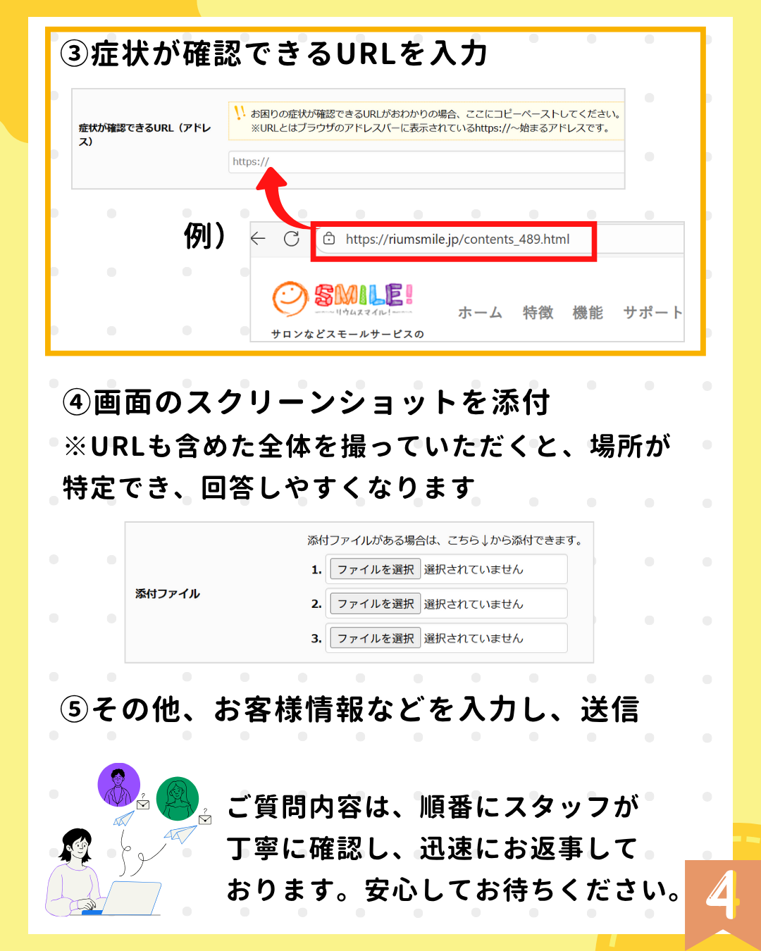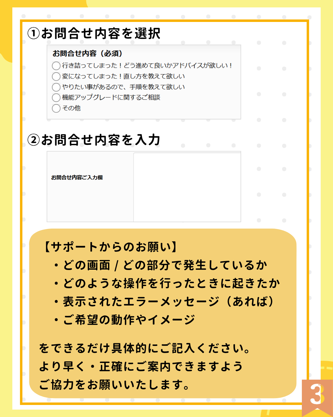 「どの画面で?」「どうなりたい?」を伝えると、解決までがスムーズです!
