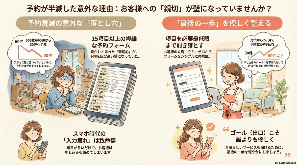 良かれと思った親切心が、皮肉にもお客様の「予約する」という行動を阻む高い壁になっていました。