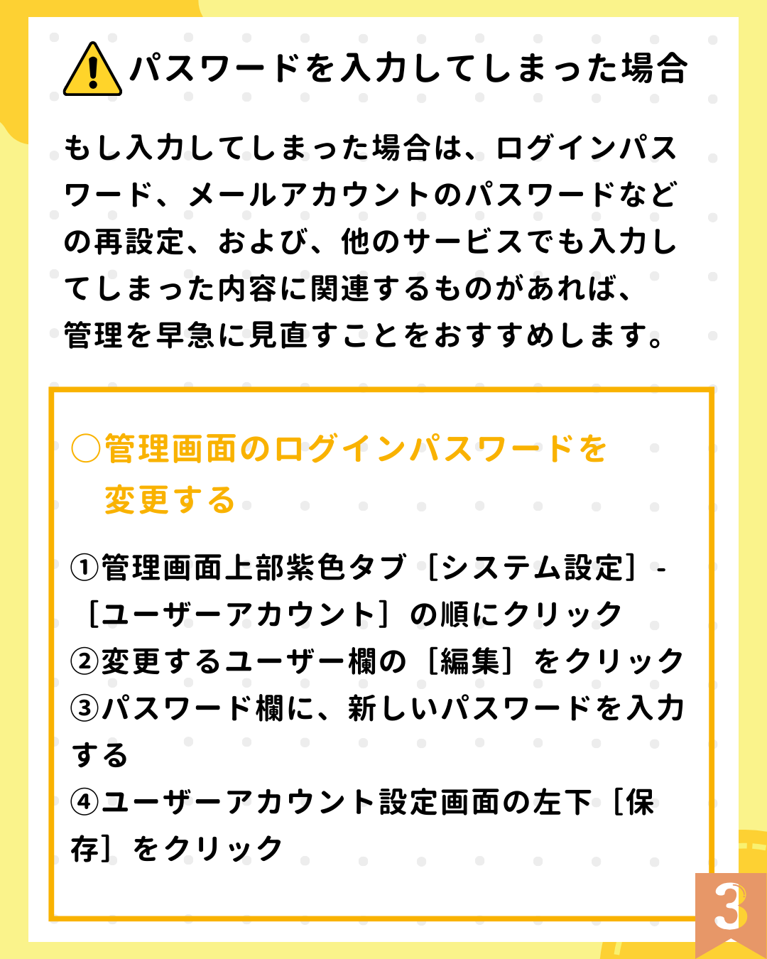 万が一パスワードを入力してしまった場合も、管理画面から変更すれば安心です。