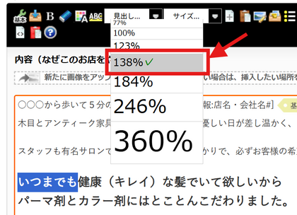 本文エディタ中で文字の大きさを変更した箇所を選択状態にし、文字サイズセレクトボックスを開いた際に、