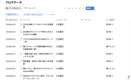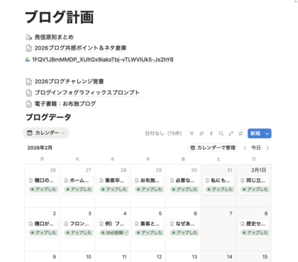 さらに、ブログ専用のデータベースを作成し、以下の項目をカレンダー形式で管理しています。