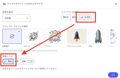 次に、画面上の「スタジオ」から「インフォグラフィックス」を選択してください。この時、設定で「正方形」と「簡易」を選んで「生成」ボタンを押すだけです。