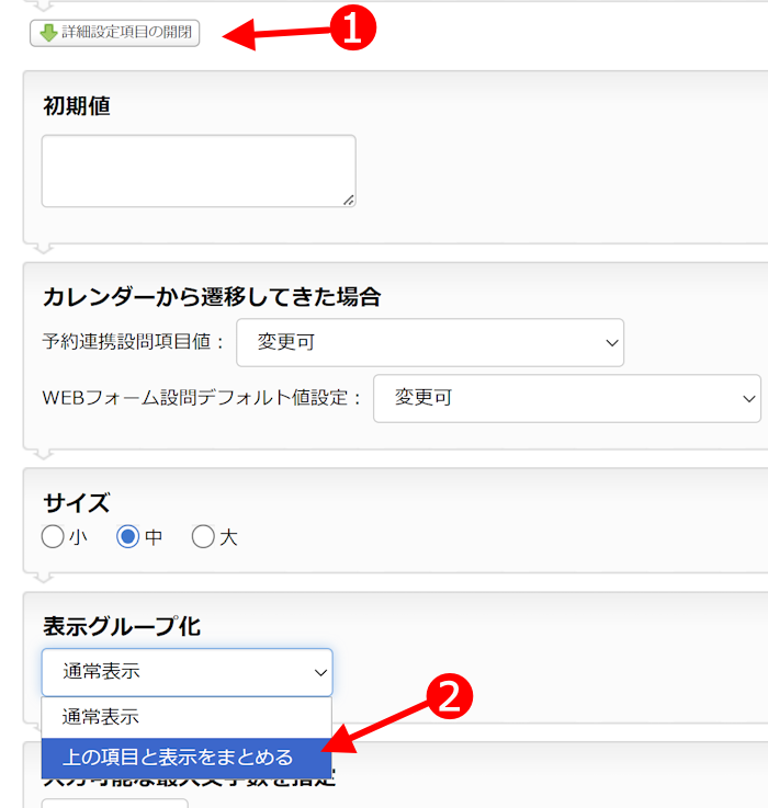 その中の「表示グループ化」を「上の項目と表示をまとめる」に変更すると、直前の設問とグループ化されたデザインが適用されます。