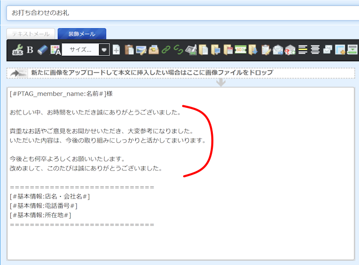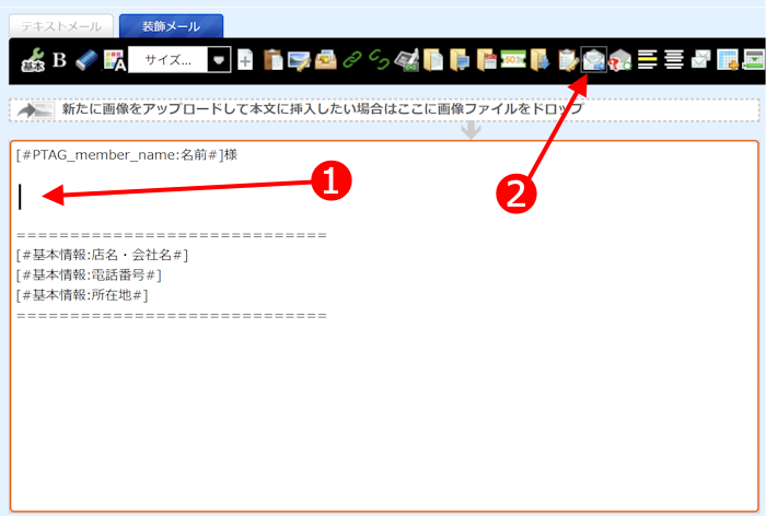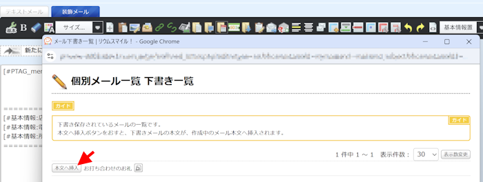 装飾メールタブ本文中の任意の箇所にカーソルを置き、本文上部ツールバーの「下書きメール挿入」ボタンをクリック