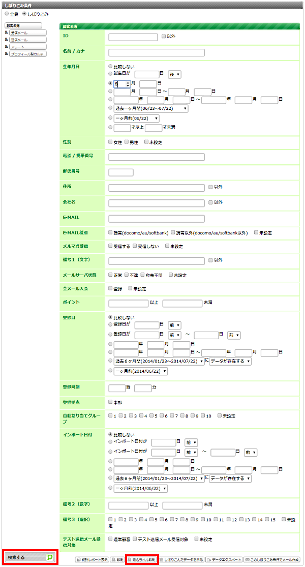 顧客名簿一覧画面上部の「しぼりこみ」にチェックをいれ、しぼりこみ条件欄の「生年月日」の欄に8月と入力
