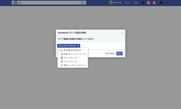 自分のタイムラインでも、友達のタイムラインでも(!)、グループでも、イベントでも、Facebookページでも配信できます。
