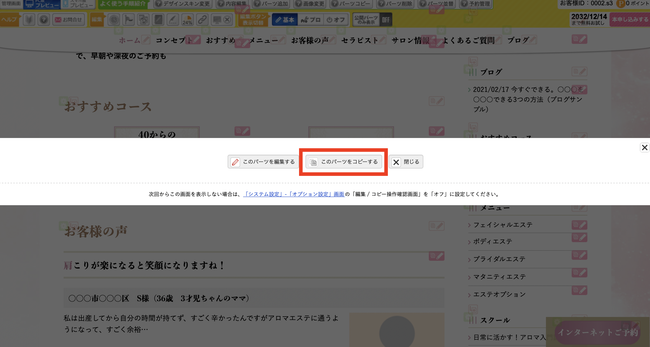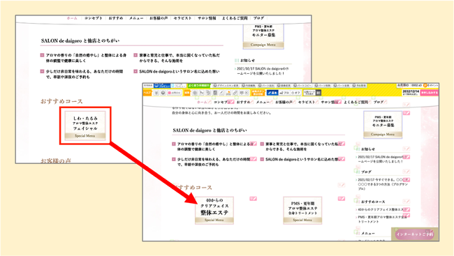 例)「しわ・たるみアロマ整体エステフェイシャル」を「40からのクリアフェイス整体エステ」に変更する