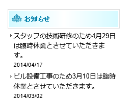 また、次の例のような、営業時間のお知らせとメディア掲載情報など、異なる種類の情報が混在したお知らせを掲載する場合、カテゴリー機能を用いてそれぞれグループ別けして表示することができます。