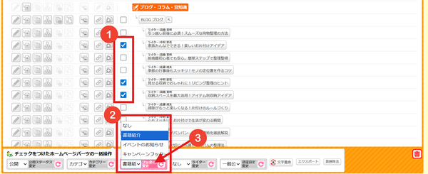 複数のパーツに同じフッターをまとめて設定したい場合は、一覧画面から一括で設定できます。