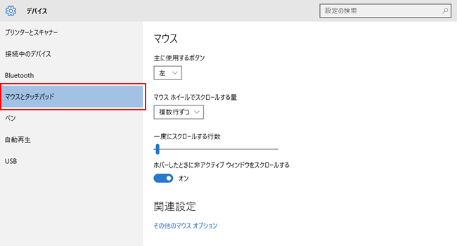 [マウスとタッチパッド]をクリックすると、右側の画面にマウスとタッチパッドの機能設定画面が表示されます。