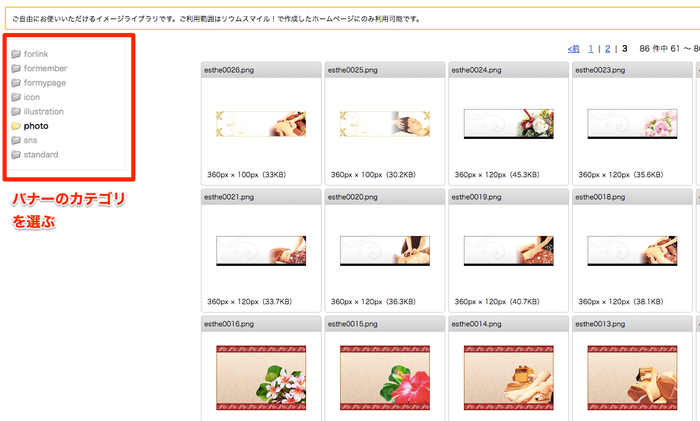 沢山のバナーがありますので、カテゴリーを選択して、自分のイメージにあう物を探しましょう。
