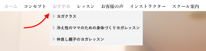 この例では、「おすすめ」にマウスを載せると、おススメメニューの3つのメニューが下に表示され、閲覧者はその中から興味のあるメニューに素早くたどり着くことができます。