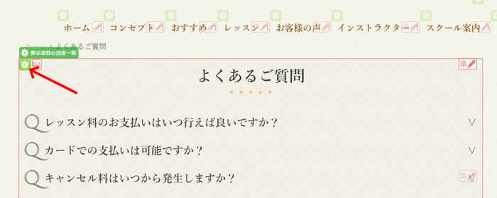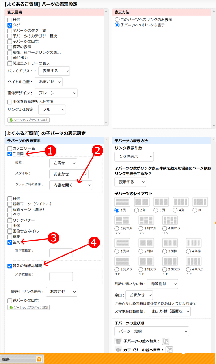 例えば次のような「よくある質問」ページのように、最初に子パーツのタイトル(質問)だけを一覧表示しておき、タイトルがクリックされると、次のように内容(回答)が開くといったような表示設定ができます。