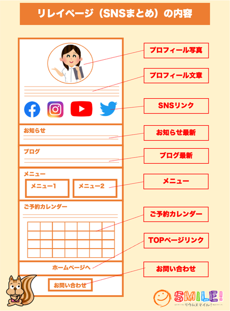 リウムスマイル!にはリレイページをつくる機能がありますので、上で紹介したような9つの項目をのせたリレイページが簡単に作れるようになっています。
