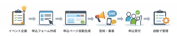 イベント概要・定員・参加費などを入力し、連携する申込フォームを指定すると、その内容をもとに、申し込み可能なイベントページが自動生成されます。