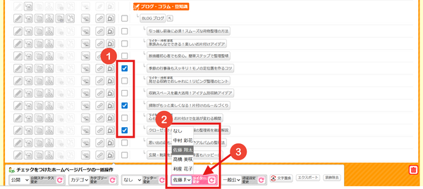 複数のブログに同じライター情報をまとめて設定したい場合は、一覧画面から一括で設定できます。