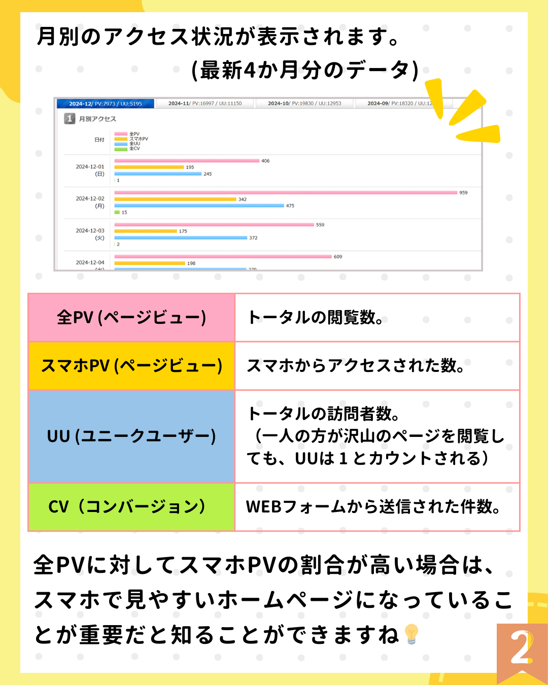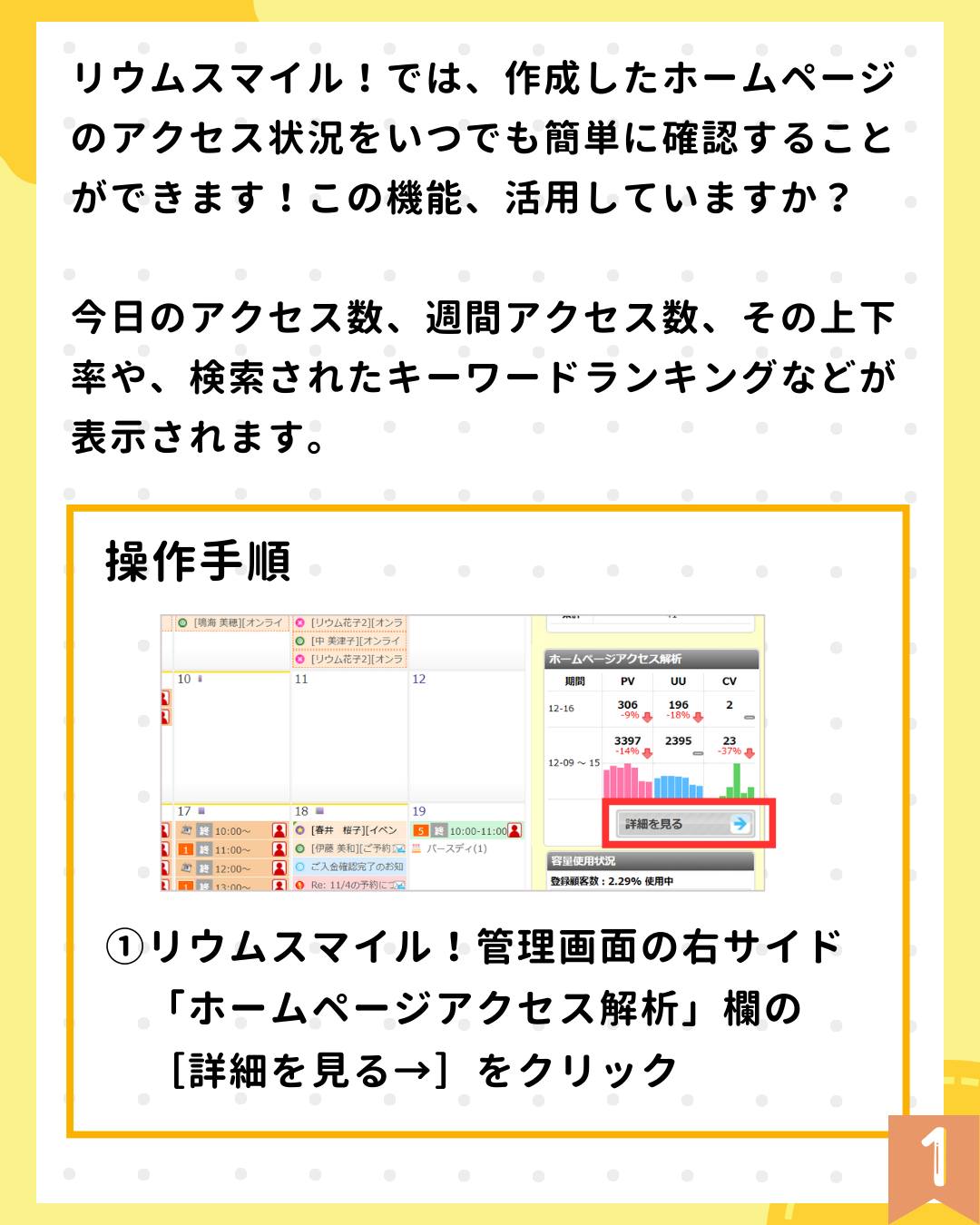 リウムスマイル!では、作成したホームページのアクセス状況をいつでも簡単に確認することができます!