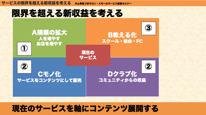 そんな限界を超える4つの具体的な新収益モデルを解説すると共に、その4つの新収益に共通する「サービスのコンテンツ化」の技法についても紹介しました。