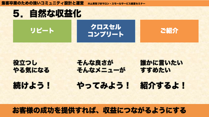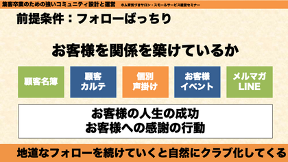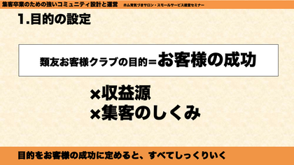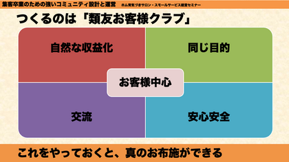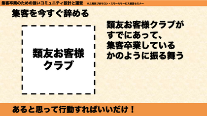 また、最後には類友お客様クラブを形成することを目的とすれば、集客の意味が変化することを説明しました。