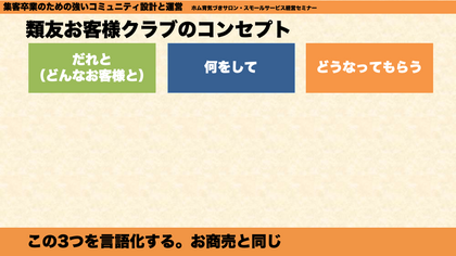 今回のセミナーでは、この類友お客様クラブをどのように意図的に形成するのか、そして運営するのか、について考えました。