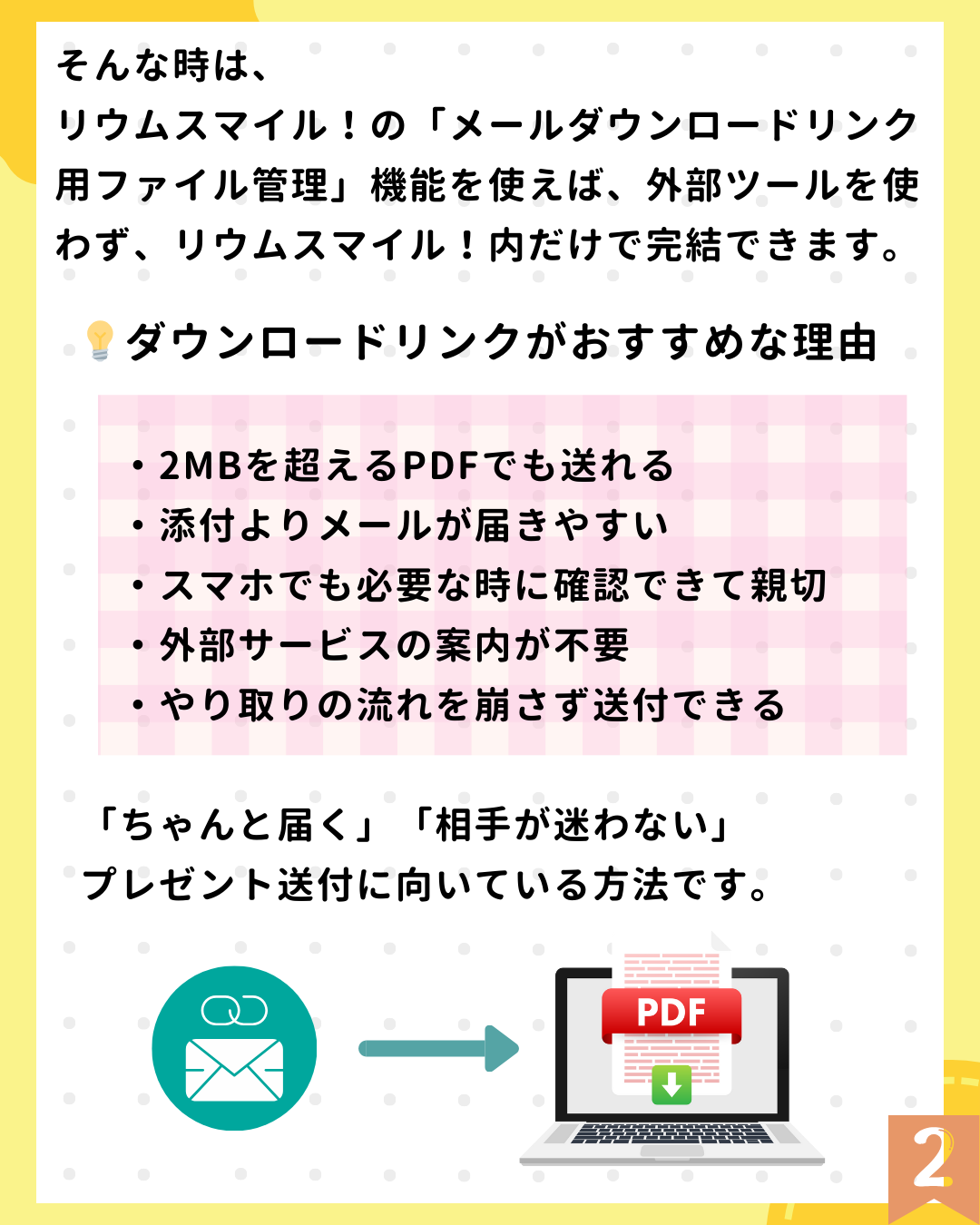 リウムスマイル!なら、PDFをメールに直接添付しなくてもOK。