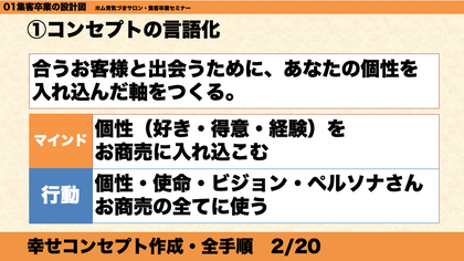 あなたの個性(好き・得意・経験)と技術を、お商売のコンセプトとしてどのように言語化するのか、その詳細な手順をお伝えします。