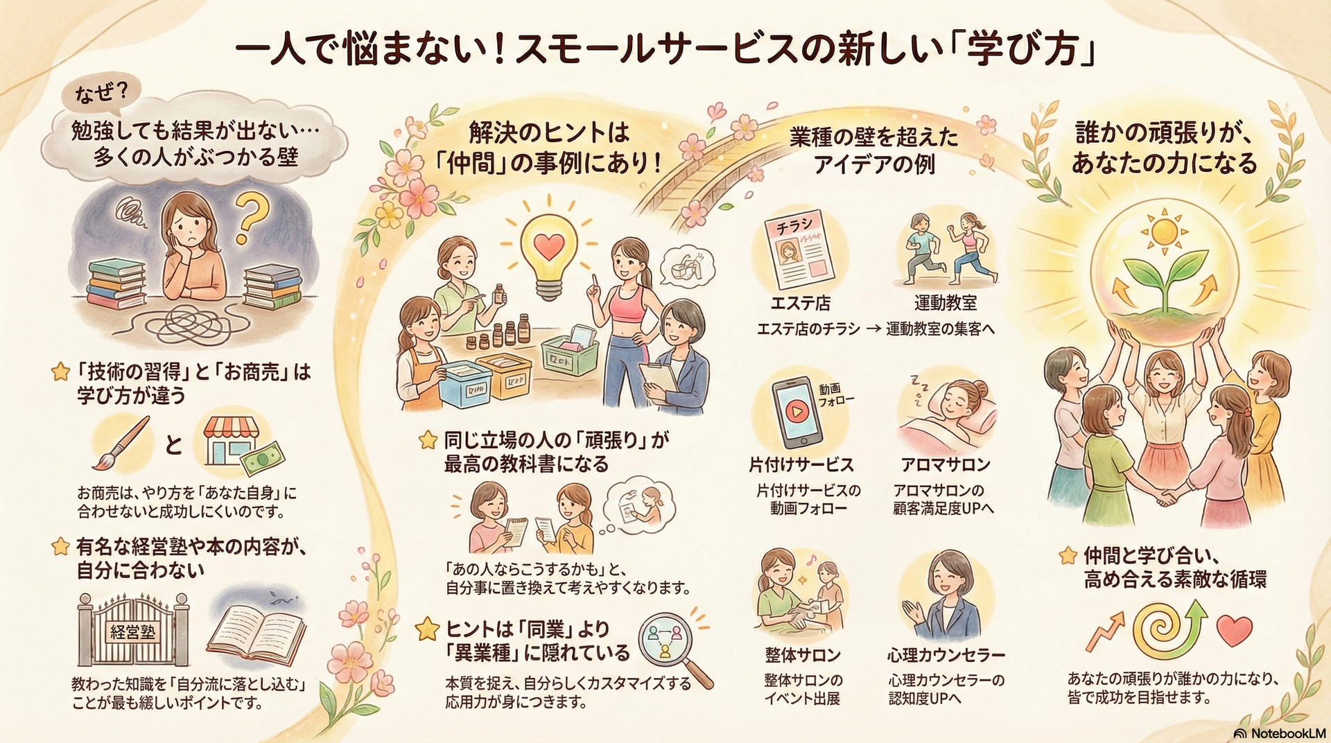 そんな仲間の頑張りを知ることで、ノウハウや事例を自分事に置き換え、自分らしいお商売で「集客からの卒業」を目指してほしい。