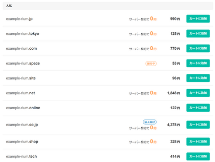 トップページで、取得したいドメイン名を入力すると、取得可能なドメインの一覧が表示されます。
