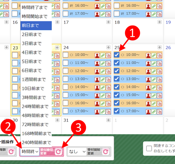 すでに作成済みの複数の予約枠の「受付開始」「受付締切」をまとめて変更したい場合は、予約管理画面から一括で設定できます。